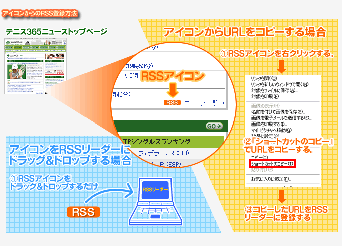 下記のURLをコピーしてお持ちのRSSリーダーに登録するだけで、テニス365の最新ニュースが自動でRSSリーダーに届きます。
